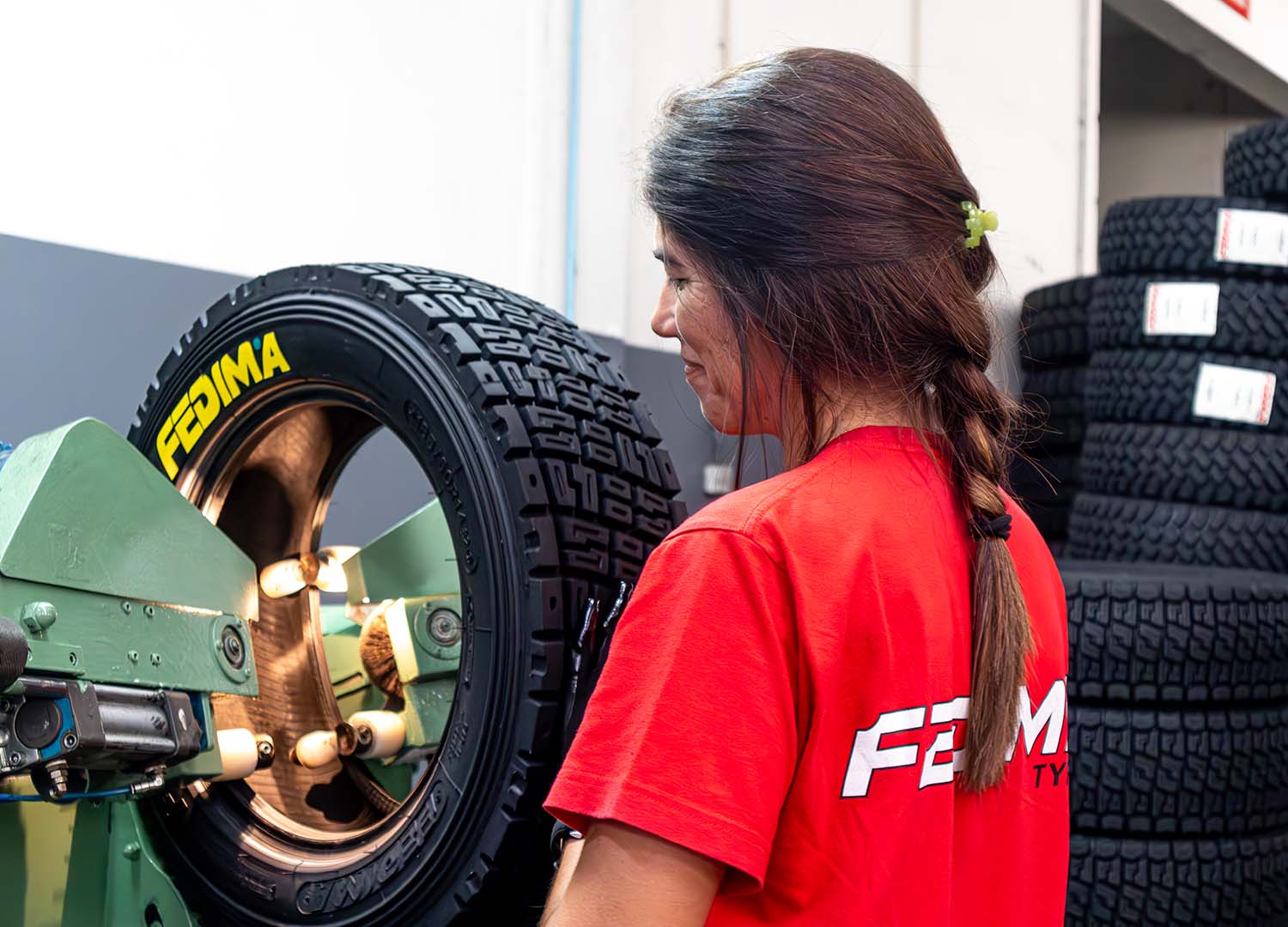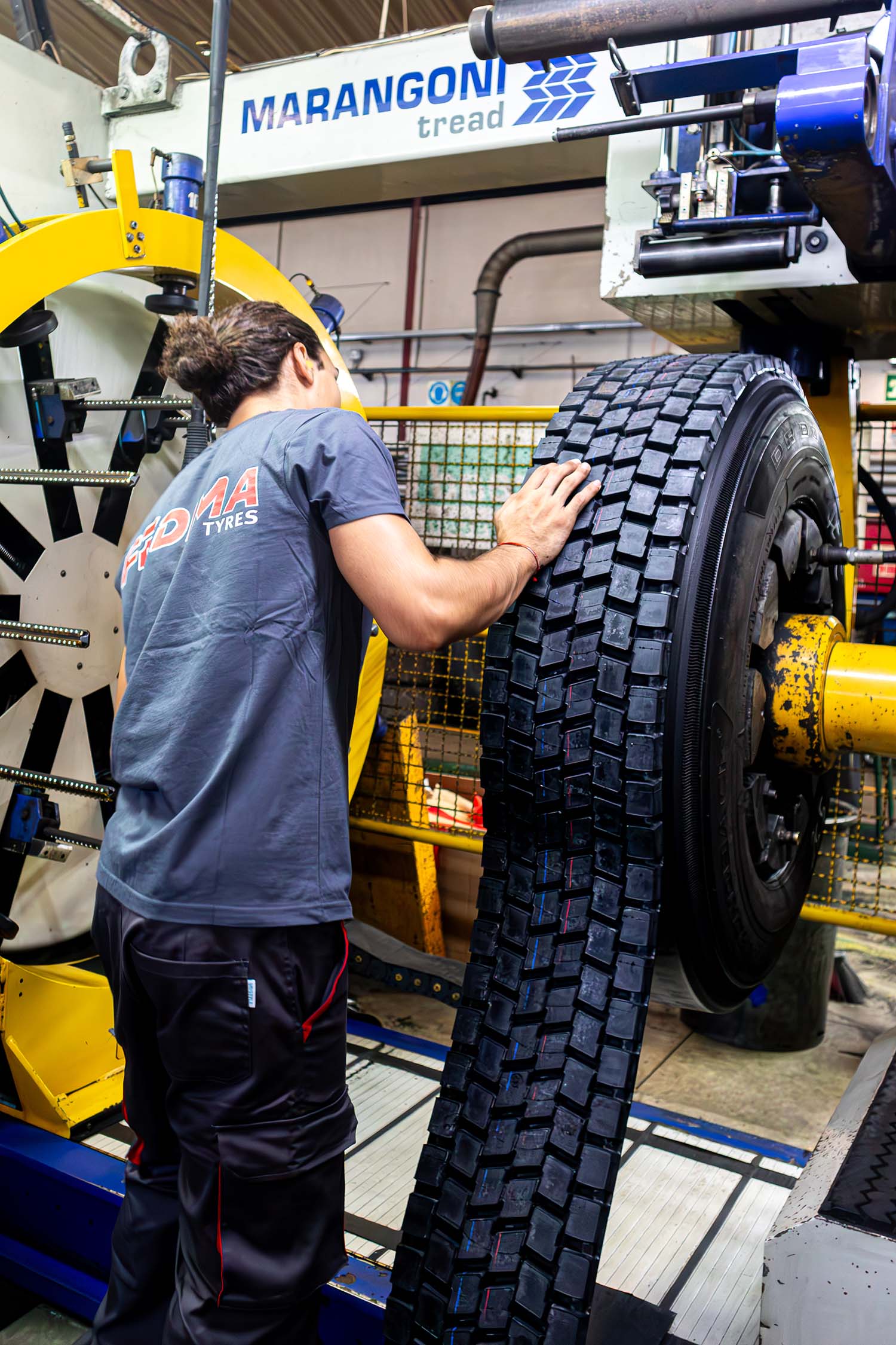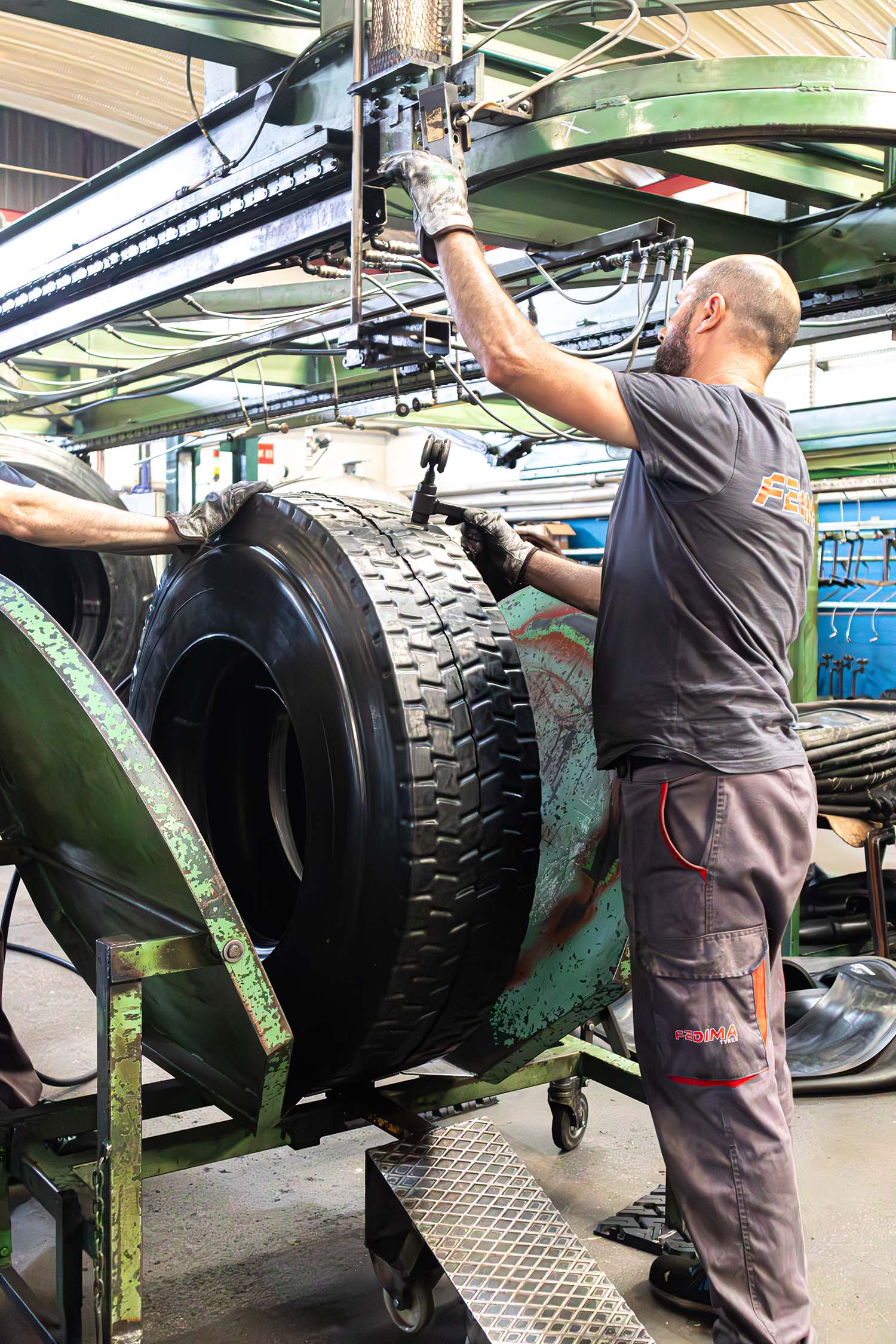 No processo de construção de recauchutagem a quente na Fedima, vários compostos de borracha são aplicados com precisão na carcaça, utilizando máquinas de controlo numérico avançado. Este método garante a quantidade certa de borracha e uma construção exata para o novo padrão de piso. A seleção de materiais é adaptada à aplicação específica do pneu, de acordo com a nossa vasta experiência e dos nossos fornecedores de confiança, assegurando que cada pneu recauchutado atinge os mais altos padrões de qualidade e desempenho.