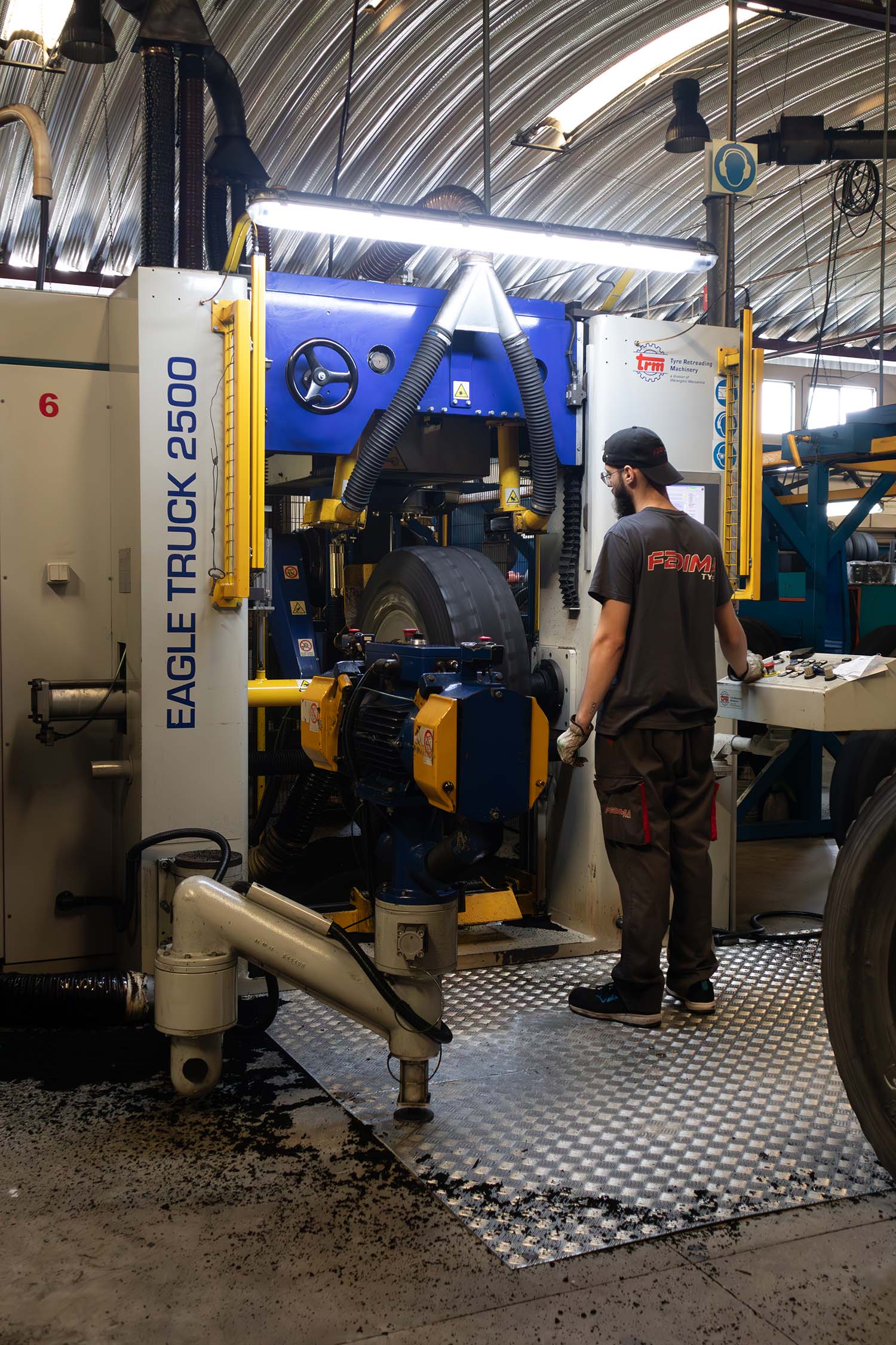 Na fase de raspagem na Fedima, qualquer resíduo de piso é removido da carcaça através de uma máquina de raspagem de alta velocidade. Esta máquina elimina o piso antigo e a borracha da parede lateral, restaurando a carcaça às suas dimensões ideais e criando uma superfície texturizada essencial para a adesão do novo piso. O equipamento de controlo computorizado e de precisão garante que cada carcaça é raspada segundo especificações exatas, ficando pronta para a próxima fase da recauchutagem.