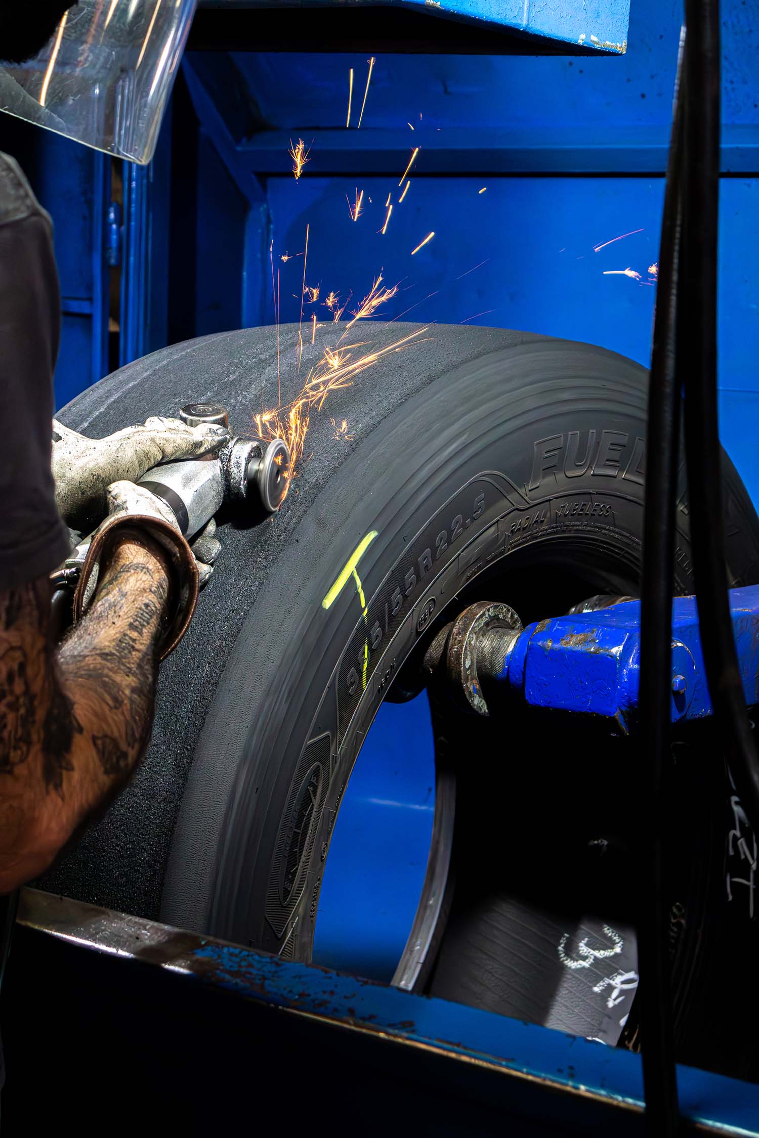 Durante o processo de reparação na Fedima, qualquer dano superficial detetado na fase de raspagem é cuidadosamente limpo e reparado. Imperfeições maiores são preenchidas e remendadas para restaurar a integridade estrutural da carcaça. Em seguida, é aplicada uma solução química para melhorar a adesão do novo piso, garantindo que a carcaça está limpa, estruturalmente sólida e pronta para uma nova vida.