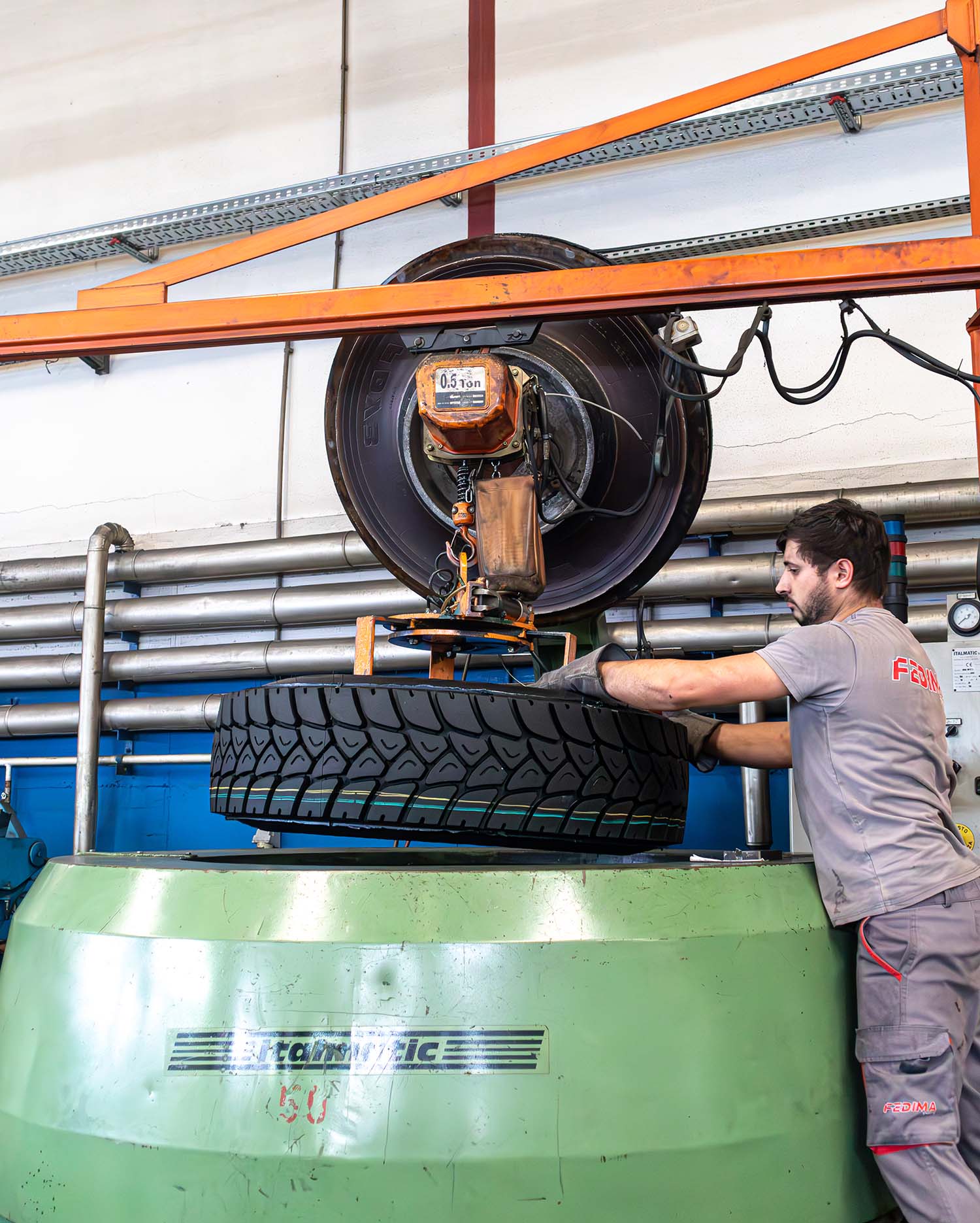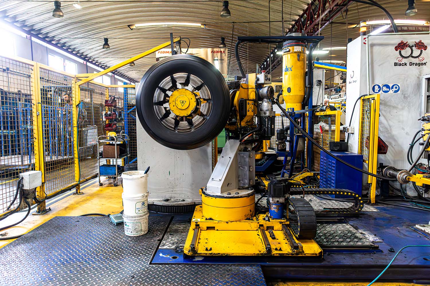 Durante a vulcanização da recauchutagem a quente na Fedima, a carcaça preparada é colocada em moldes especializados para vulcanização, onde calor e pressão são aplicados para atingir o padrão de piso desejado. Os moldes são cuidadosamente selecionados para manter a uniformidade e a qualidade no produto final. Este passo essencial liga o novo piso à carcaça, produzindo um pneu durável e fiável, pronto para um uso prolongado na estrada.